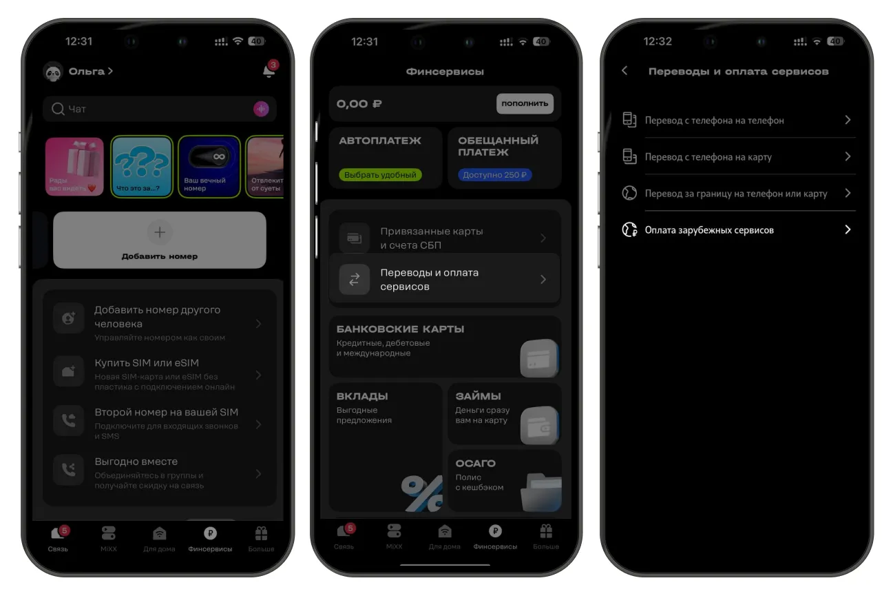 Откройте приложение T2, перейдите во вкладку «Финсервисы» и выберите «Переводы и оплата сервисов».