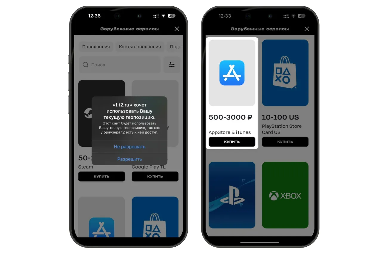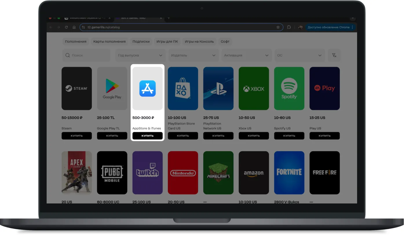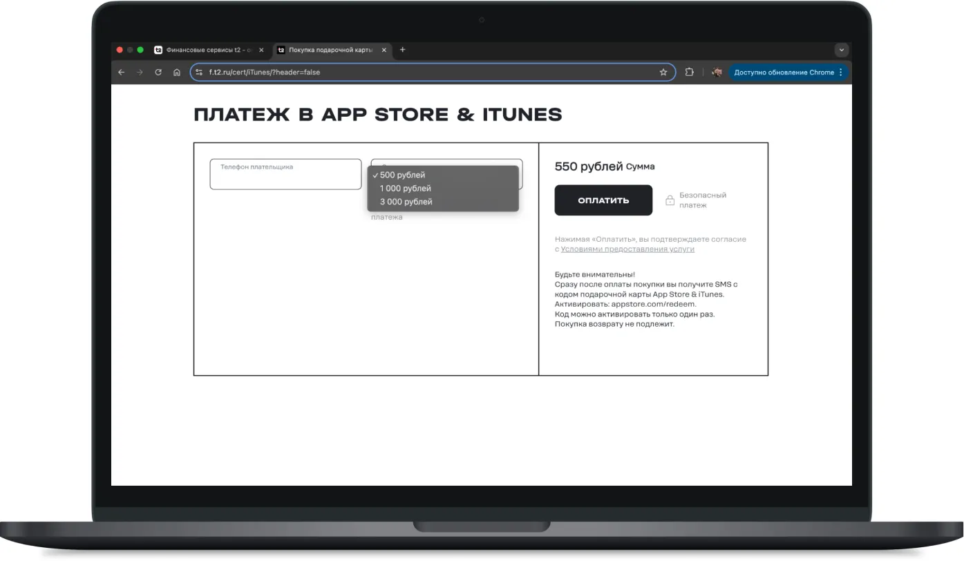Если вы абонент T2, не хотите рисковать или переплачивать, есть простой способ — оплатить российскую подарочную карту с баланса телефона с минимальной комиссией.