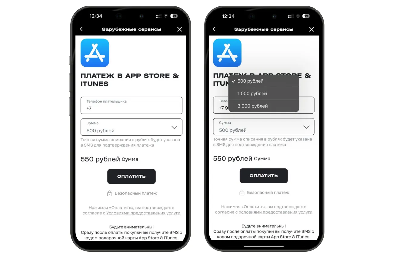 Введите свой номер телефона и номинал карты, которую вы хотите купить: 500, 1000 или 3000 рублей. Нажмите «Оплатить».