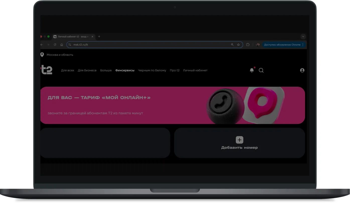 Зайдите в личный кабинет на сайте T2 и перейдите во вкладку «Финсервисы».