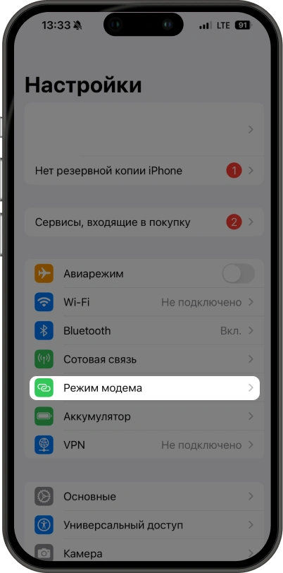 Раздел «Режим модема» появится в настройках сразу после пункта «Сотовая связь»