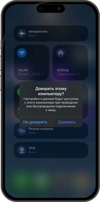 Сначала активируйте на iPhone режим модема и подключите его к ноутбуку с помощью кабеля. На экране смартфона появится запрос: «Доверять этому компьютеру?». Нажмите «Доверять», после чего введите код‑пароль для подтверждения. Дальше система сделает все сама: устройство автоматически распознает iPhone как источник интернета и подключится к сети. Никаких дополнительных настроек вводить не нужно — интернет заработает сразу.